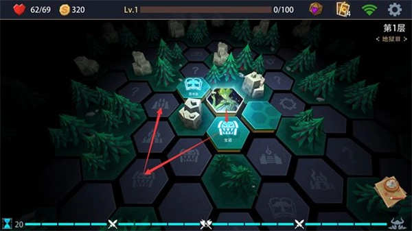 比如上图中从下方出发,拿到3个宝箱后前往遗忘神殿,把心魔牌(地狱难度开局卡组里会加入2张心魔牌)移除后,就会进入第一次战斗。