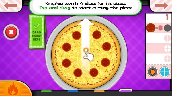 在Papa's Pizzeria,顾客会订购切成四块、六块或八块的披萨。要切片比萨饼,玩家必须在比萨饼上拖动鼠标(或滑动手指)以确定比萨饼切片机在比萨饼上的路径。如果切的片数不正确,或者片大片小,则在将披萨呈现给顾客时将被扣分。