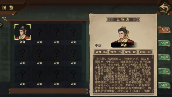 还有图鉴、成就等功能,目前只解锁了刘备这一个角色,所以图鉴里的人物都显示为问号。