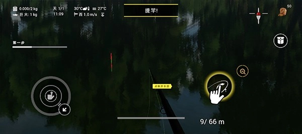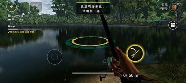 左边的圆圈用于控制方向,你可以滑动左下角的摇杆,以此到达最佳的钓鱼位置。