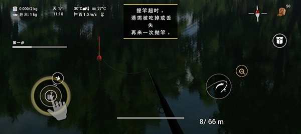 要是鱼脱钩跑掉了,我们可以长按左下角的图标把钩子收回来,接着再甩钩垂钓。