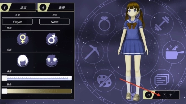 4、之后可以给你的角色,设置语言、服饰、头发、身高、肤色等等;