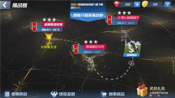 接下来是排位赛环节,这是我们与其他玩家比拼实力的舞台。如果能击败排名高于自己的对手,我们就能取而代之,晋升到对方的排名位置。排名越靠前,每日可领取的欧元、宝石以及排位币就会越丰厚。值得注意的是,排位赛过程中我们无法实时操作,所有战术执行都严格依照赛前设定。因此,我们需要仔细分析对手的阵容配置,研判其战术思路,在赛前就针对性地调整战术来克制对方。此外还有巡回赛和挑战赛:巡回赛要求我们派遣球员加入其他球队阵容,参与各地的商业赛事;挑战赛每天设有15个关卡,只有满足关卡特定条件完成比赛,才能获得全额奖励,否则仅能算作通关。