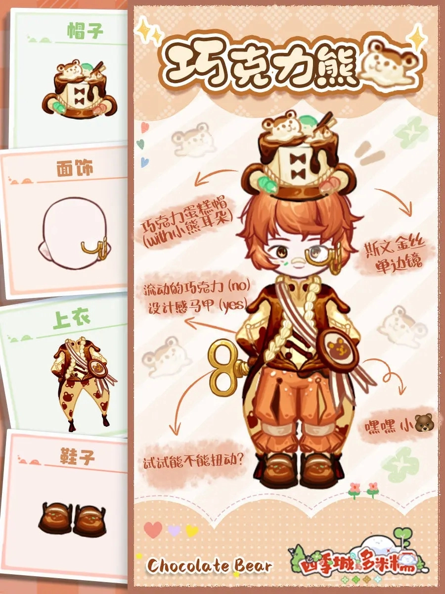 瞧瞧这巧克力小熊的耳朵,还有蛋糕模样的礼帽,再加上那宛如流淌着的巧克力般的马甲,是不是已经有一股浓郁醇厚的香气仿佛要扑面而来了呢~