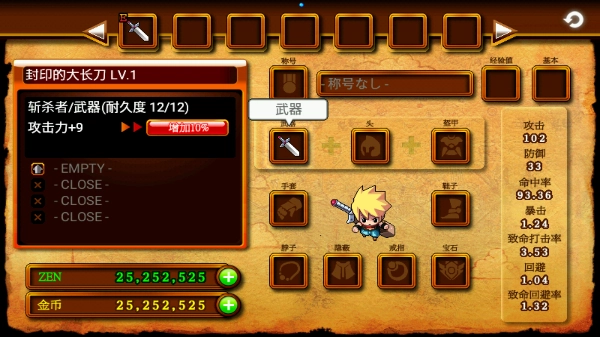 人物状态(STATUS)。在这个界面中,你可以看到角色的各项状态信息,涵盖各类属性数值。 第一行显示的是:ATT(ATTACK)攻击,DEF(DEFENCE)防御,HIT(HIT RATING)打击率(也就是命中)。 第二行包括:CRI(CRITICAL)致命一击,C.DMG(CRITICAL DAMAGE)致命伤害(属于加成伤害),EVA(EVASION)闪避,C.EVA(CRITICAL EVASION)致命闪避。不过需要特别说明的是,这里的致命一击和闪避并非概率属性——即便你将致命一击的数值堆叠到100,也无法保证每次攻击都触发致命效果,这些属性的实际生效机制遵循特定的计算公式。 第三行列出的是:STR(STRENGTH)力量,DEX(DEXTERITY)敏捷,CON(CONSTITUTION)体力,INT(INTELLIGENCE)智力。