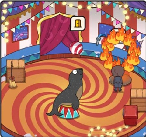 先从抓娃娃机里取出小仓鼠,和帐篷旁的仓鼠一起发电(要是帐篷内光线暗,得先点击仓鼠)。进入帐篷把球递给海豹,按照海豹顶球的规律得出红箱子密码324,打开箱子取走水管和钥匙;随后将水管接到消防栓上,打开消防栓后把水管放进帐篷,用水把火扑灭,再用钥匙打开红色车门,按下红色按钮开启车灯,把光斑拼成圆形,从车里拿出钳子帮小猫脱离危险。
