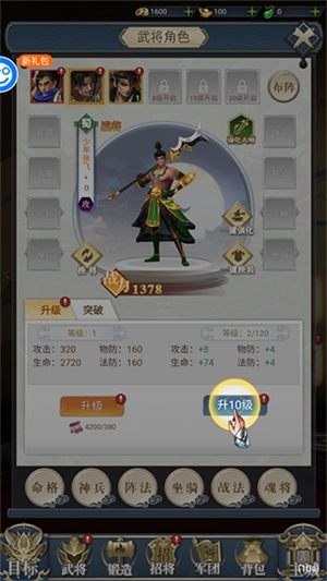 要优先凑齐的物品,不仅能升级提升主属性,和武将对应的橙色宝物、神兵凑齐后触发的羁绊效果,对武将战力提升也很显著。后续培养时,还能增加暴击、命中等特殊属性来进一步提高战力;同时,神兵与宝物的进阶,也可通过界限突破提升品质,从而增强战力。