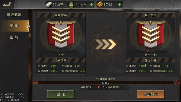 通过改造能够提升坦克的品质,品质等级从低到高排列依次是白色、绿色、蓝色、紫色和橙色。品质等级越高,为坦克带来的战力加成也就越显著。此外,坦克需要先完成升级,才能装配更高级别的配件,同时也只有升级后的坦克,才具备进行更高级改造的条件。而无论是坦克本身的战力,还是个人的综合战力,都能通过改造得到大幅度的提升!