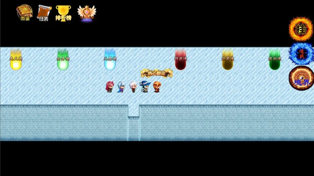 像素风的游戏画面,多个Q版可爱的人物角色。