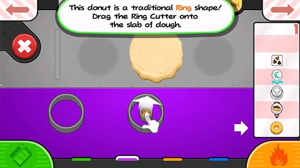 第一个操作间为生面团站,制作甜甜圈需用到具有特殊形状的生面团,玩家要挑选一块面团放置在工作区域。接着用擀面杖将其擀成圆形面饼,再通过模具来完成造型。