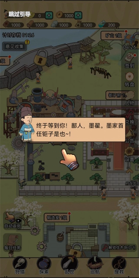 防御守城(建议等弟子数量增多后,在巨子府安排多个弟子上阵再去进行防御,凭借数量优势和科技优势直接碾压对手)