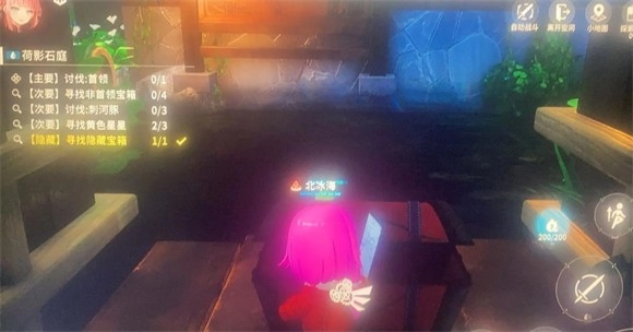 荷影石庭的隐藏宝箱位置如图所示,开启该宝箱后,磁带的位置就会在夜樱庭的小地图上显示出来。