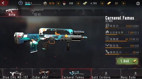 攻击力1544,火灾发生率12.5,准确度68.5%,稳定性250,弹夹大小46,需1010金条解锁。