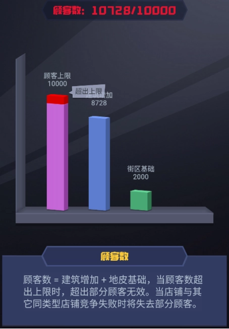 顾客属性里白色数字代表该地块的基础顾客数量,绿色数字则是建筑所提升的顾客数量。