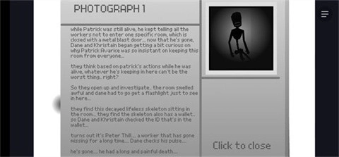 PatrickAvarice工作时,不慎碰倒了一支装有未知黑色液体化学物质的试管。一开始他没太在意,便让工厂看门人凯文·普杰去清理。凯文动手清理时脚下一滑,脸朝下摔进了黑色液体里。随即凯文开始浑身抽搐,嘴里发出怪异的声响,这引起了帕特里克的注意。他上前查看情况,发现凯文正用力揉搓眼睛。突然,凯文的头顶猛地裂开,溅出些许脑浆,在他抬头看向帕特里克前,帕特里克看到了他脸上那令人不安的笑容,一时不知所措,只能惊慌地呼喊其他员工帮忙。