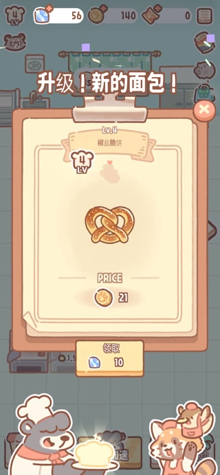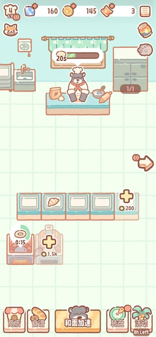 持续烘焙出美味的面包,积极宣传推广,积累更多资金后就能解锁右侧的休息室,供员工在此休憩,同时还能购置墙纸、地板和各类家具来装点空间!