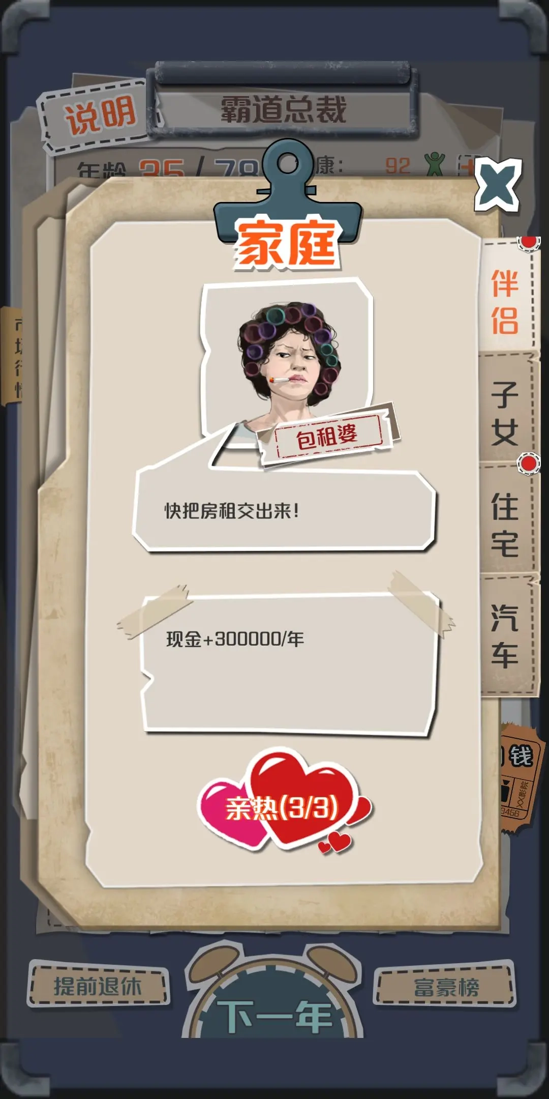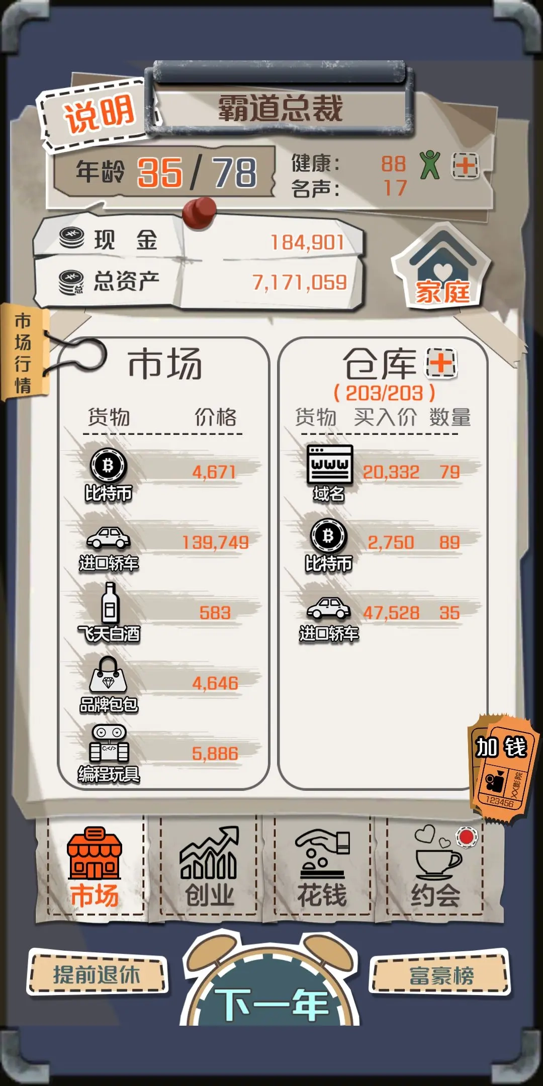这是一款相当有趣的人生模拟游戏,想必不少玩家都曾有过后悔的人生抉择。在这款游戏里,每位玩家都能获得重生的契机——若能重返20岁,你会做出怎样的选择?游戏提供了多种致富方式供玩家挑选,无论是倒买倒卖物品、自主创业,还是通过博彩获利,都有实现的可能。而伴侣还能为你带来显著的收益加成,这也印证了那句“一个成功男人的背后,离不开一位支持他的女人”。