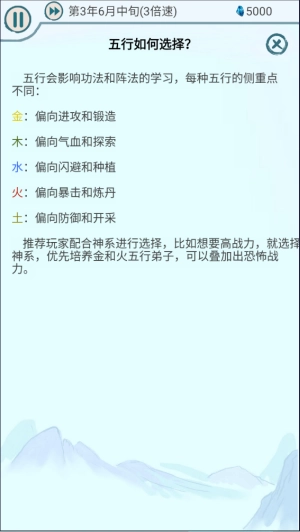 五行会对功法与阵法的学习产生影响,不同五行各有其侧重方向。建议玩家结合神系来做选择,例如若追求高战力,可挑选大荒帝俊神系,着重培养金、火属性的弟子,如此能叠加出极具威慑力的战力。
