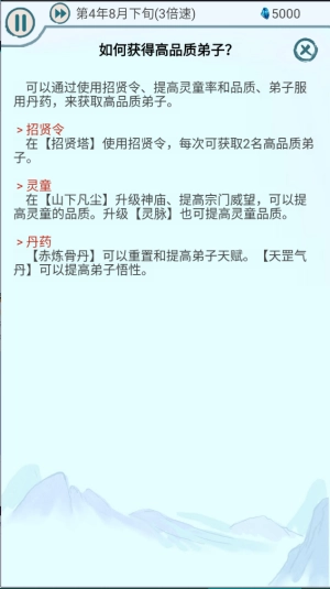 丹药:服用【赤炼骨丹】能够重置并提升弟子的天赋。使用【天罡气丹】则可以增强弟子的悟性。
