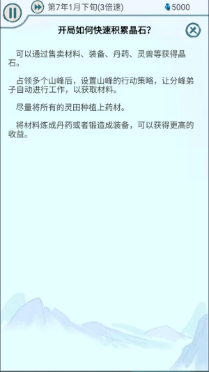可以通过售卖材料、装备、丹药、灵兽等途径获取晶石。占领多座山峰后,可对各山峰设置行动策略,使分峰弟子自动开展工作来获取材料。要尽可能把所有灵田都种上药材,再将材料炼制成丹药或打造成装备,这样能获得更高的收益。