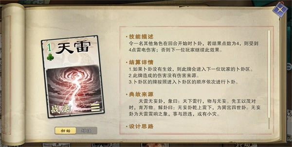 卜卦:部分战法牌会在回合起始时进行卜卦判定,卜卦区的牌会进入卜卦区依次进行卜卦。例如天雷会抽一张牌,如果是4,就会受到4点伤害。
