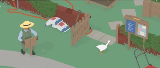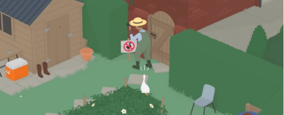完成大部分挑战后,园丁会立起禁止鹅进入的指示牌;当园丁举起大锤子准备砸下去时,对着他大吼一声就能让他砸到自己的手。