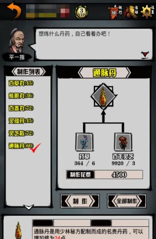 前往洛阳坐标为(15,28)的回春堂,找到并点击制作选项,接着在可选物品中选择通脉丹(制作该丹药需要6个药草和3个百年灵芝),最后点击制作按钮,就能成功得到一颗通脉丹。