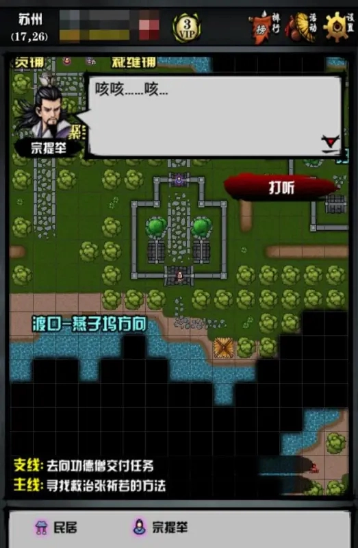 在沧州(3,2)接到第一颗珠子的任务后,前往木桥(15,2)进行探索。选择“栏杆”选项并执行“爬下去”的操作,之后走到(21,6)的位置,探索时选择“摸鱼”可获得星辉石。从衙门上岸返回后,将星辉石镶嵌在右上角的柱子处。
