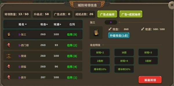 首先来聊聊将领,当前这个模式里只有三种类型的将领:第一种是投石车,它是主要的伤害来源,擅长范围伤害,技能点满后还能眩晕敌人并造成二次伤害;第二种是炸弹人,作为副伤害来源,同样具备范围伤害能力,同时还能为城墙回血;第三种是弓箭手,单体伤害最高,在前10关是主力输出,到了后面主要依靠冰箭来发挥减速作用。