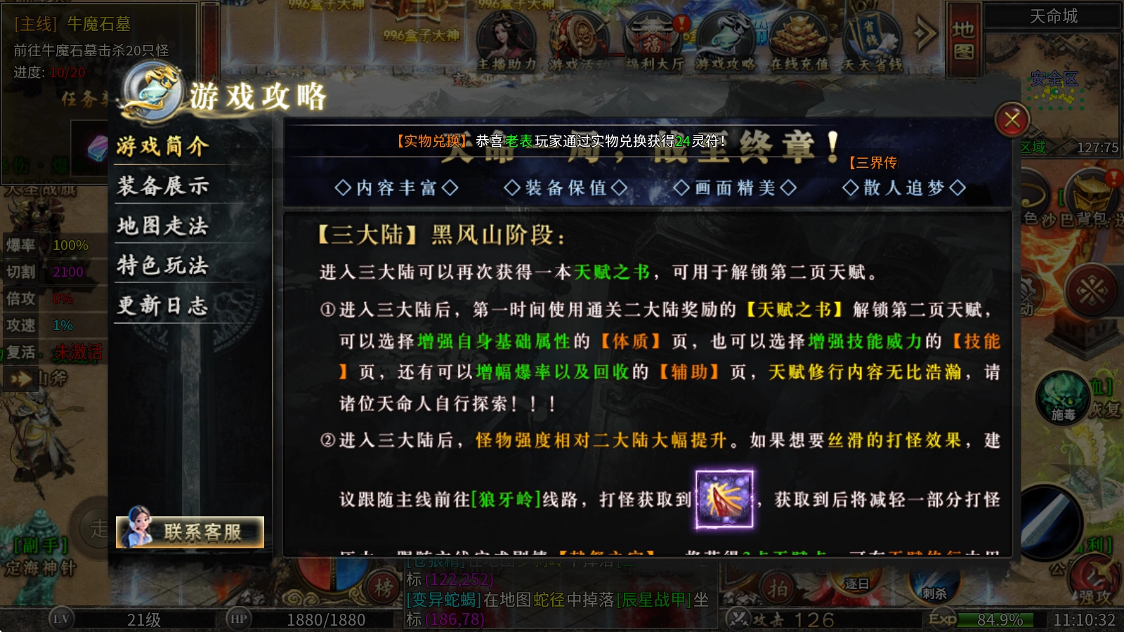 完成二大陆第一章节任务后,可获得1本【天赋之书】,该道具用于解锁本服核心玩法“天赋修行”。前期打怪时,建议优先将[精准切割]点满;在尚未获取【十方敕令】这一斩血道器前,点满切割后可多分配点数给[疾刃骤雨]以提升攻速,从而提高打怪效率。