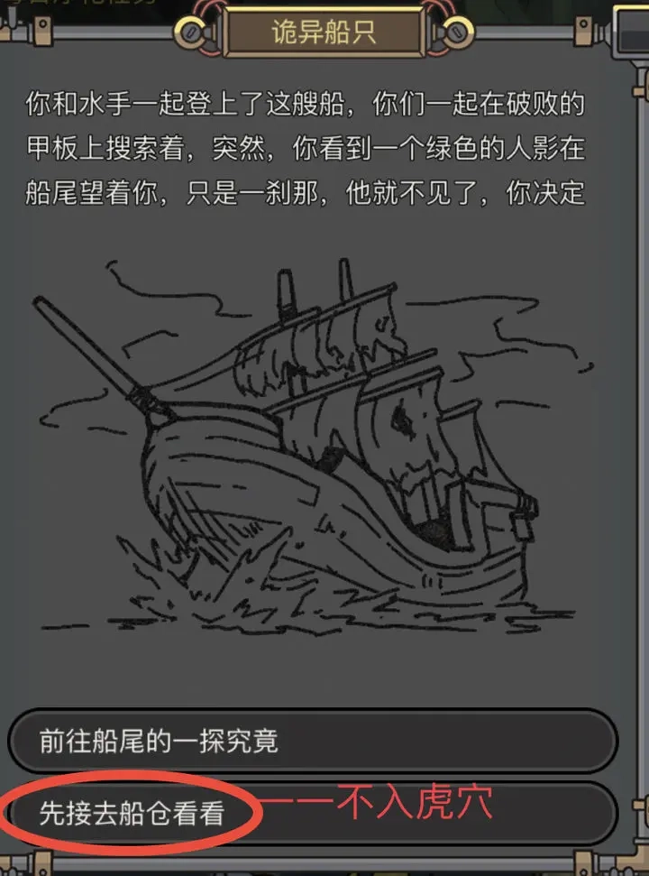 选择:直接前往船舱——获得20张线索页,或导致事件结束 选择:继续搜寻木板→撬开木板查看→发现一枚巨大的卵