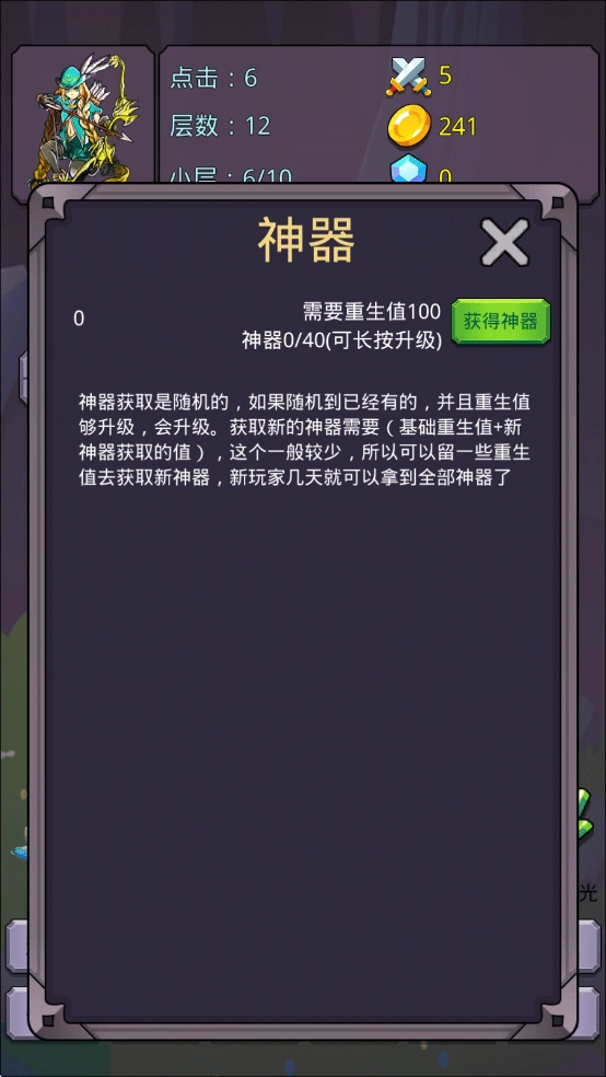 目前共有11个神器,其中一部分属于提升战斗能力的类型,像暴打挂机神器这类,能够增强自动攻击的效果;另外还有一些具备特殊功能的神器,例如跳关神器。对于刚开始接触的新手玩家,建议在游戏前期优先升级战力型神器,比如增加攻击力、提升金币获取效率、提高10倍金币触发概率以及降低英雄升级费用的这些类型。等后续自身战力有所提升,能够通过的关卡数量增多后,再去考虑升级跳关神器,实际上到了游戏后期,跳关神器也会发挥非常关键的作用。
