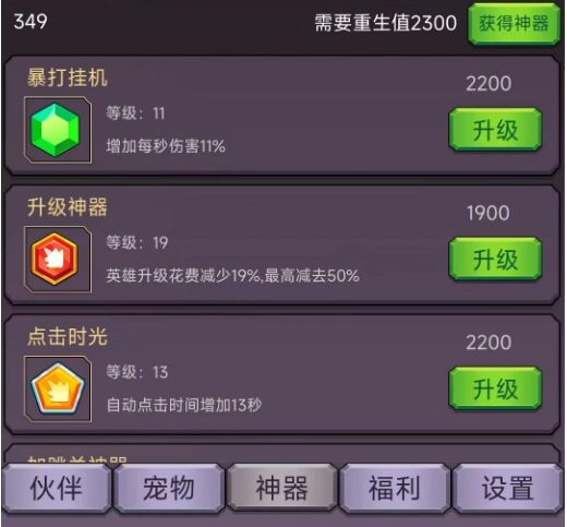 其次是跳关神器的前30%部分,还有速度机器、暴击之器。优先主要升级跳关神器,另外两个被选进来是因为它们价格实惠,而且带来的提升比较明显。