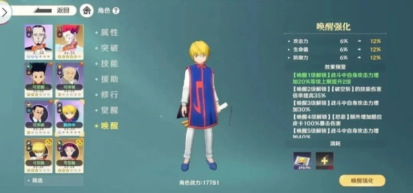 角色觉醒达到满星后将解锁唤醒功能,玩家需先把角色的突破等级与好感度提升至特定阶段,再消耗角色碎片和唤醒石完成唤醒操作。唤醒后的角色,卡牌会呈现七彩光芒特效,同时基础三围(生命、攻击、防御)属性以及某条被动技能的效果都会得到增强。这是一条适合中后期推进的养成路径,建议在角色等级、突破等级、觉醒状态均已拉满时,着手追求该养成线。