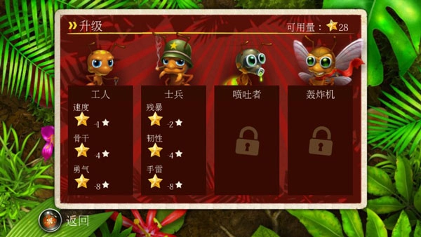 游戏里设有工人、士兵、喷吐者和轰炸机这四种蚂蚁类型,通关关卡后能得到星星奖励,这些星星可用来增强各类蚂蚁的能力与属性。