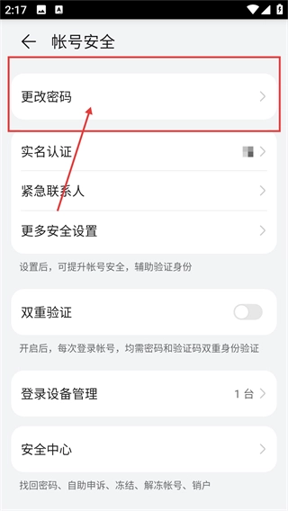 在账号安全页面点击【更改密码】选项,即可进入密码修改界面,为更换账号登录密码做准备。