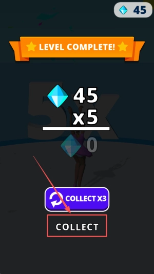 4、领取奖励:当画面显示“LEVEL COMPLETE! 45 X5”,点击“COLLECTX3”按钮,领取三倍奖励并进入下一关。