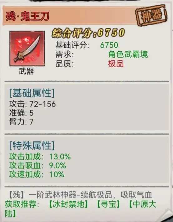 鬼王刀是前期的最优选择,这个阶段没有太多需要严格卡时间击杀的boss,只要角色能保证生存,就算慢慢消耗也能磨死boss,而鬼王刀的吸血效果刚好适配这种打法;到了中期,就可以换成剑或者枪这类武器了。