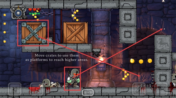 3、把木箱推过去当作平台,就能抵达高处区域,拿到更多金币奖励,帮助推进关卡进度。