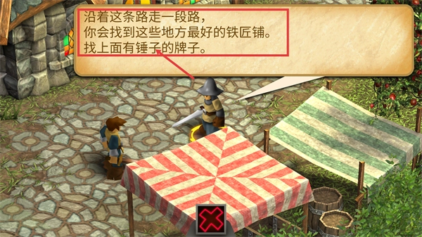 2、按NPC提示【沿着这条路走一段路,你会找到这些地方最好的铁匠铺。找上面有锤子的牌子】,依线索前往铁匠铺。