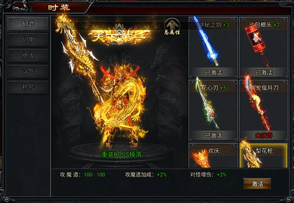 时装系统涵盖幻武、幻甲、绝版、斗气、称号五大类别,每个类别下都有若干数量的时装单品,且每件时装都具备独特的属性增益效果。这些属性具体包括:攻击、魔法、道术属性,攻魔道百分比加成,对怪物造成的额外伤害,物理防御与魔法防御,生命值与法力值的加成比例,怪物掉落物品的概率提升,PK战斗中的伤害增加,无视目标防御的效果,直接切割敌人的伤害数值,受到伤害时的减免比例,武器与盔甲的掉落概率,对怪物触发斩杀效果的几率,以及触发斩杀时对怪物造成的固定血量伤害和防御属性的加成等。
