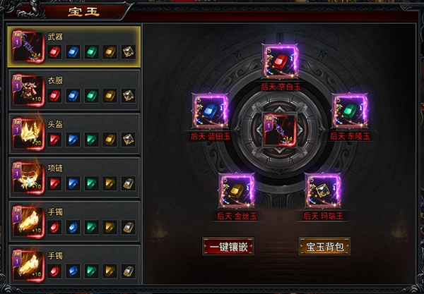 在游戏里,玩家能够借助主界面的宝玉图标进入宝玉界面进行镶嵌操作。宝玉总共包含5种类型,并且被划分为7个不同的品级,具体依次为下品、中品、上品、绝品、后天、先天以及珍稀。通常来说,宝玉的品级越高,它所能带来的属性加成提升效果就越显著。而那些高级别的宝玉,是需要通过消耗低品级的宝玉来进行合成的;至于低品级的宝玉,则可以通过打怪或者参与活动的方式来获取。