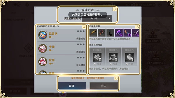 ●当您确认好要派遣的宠物以及选择的增益效果后,点击确定按钮就能开启探索之旅啦;