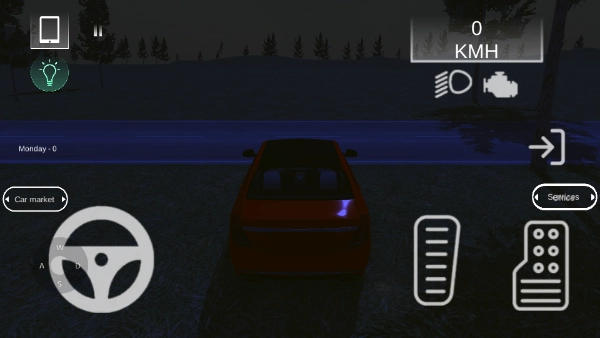 左边的轮盘用于控制车辆方向,右侧的按键分别对应刹车和后退功能,点击右上角的按钮即可开启远光灯。