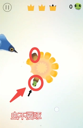 8、第八关的时候有一只蜜蜂如果啄到了会加五只虫子在上面,基本上就会输掉想要三星通关就不要啄到在旁边空白地方飞舞的蜜蜂。
