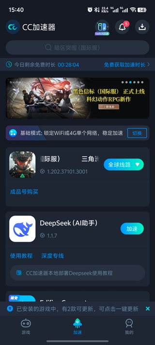 首先在本站安装三角洲行动国际服的最新版本,安装好之后打开加速器(像CC加速器、奇游加速器这类都可以),接着在加速器里找到这款游戏,点击加速按钮就可以了。