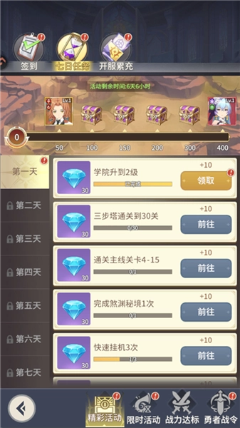 从注册起,每日都会更新任务内容,需在七天内完成。核心奖励为钻石,每完成一个任务可获得[30钻石]与[10任务点];当任务点累积到指定数量时,就能开启宝箱获取召唤券和[神活法师碎片],这对前期提升助力显著。