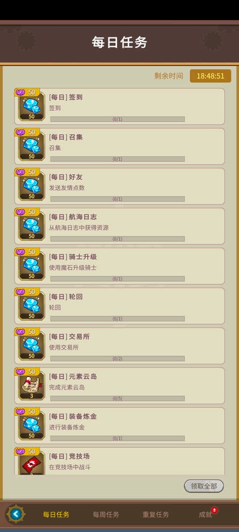 14、右侧1点钟方向是任务大厅,里面有所有任务的列表,不仅仅是主线任务,包括每日任务、每周任务、重复任务和成就任务,且任务会有时间限制,到期会进行新的任务分配,除了成就任务之外,其它均可以一键领取全部任务奖励!