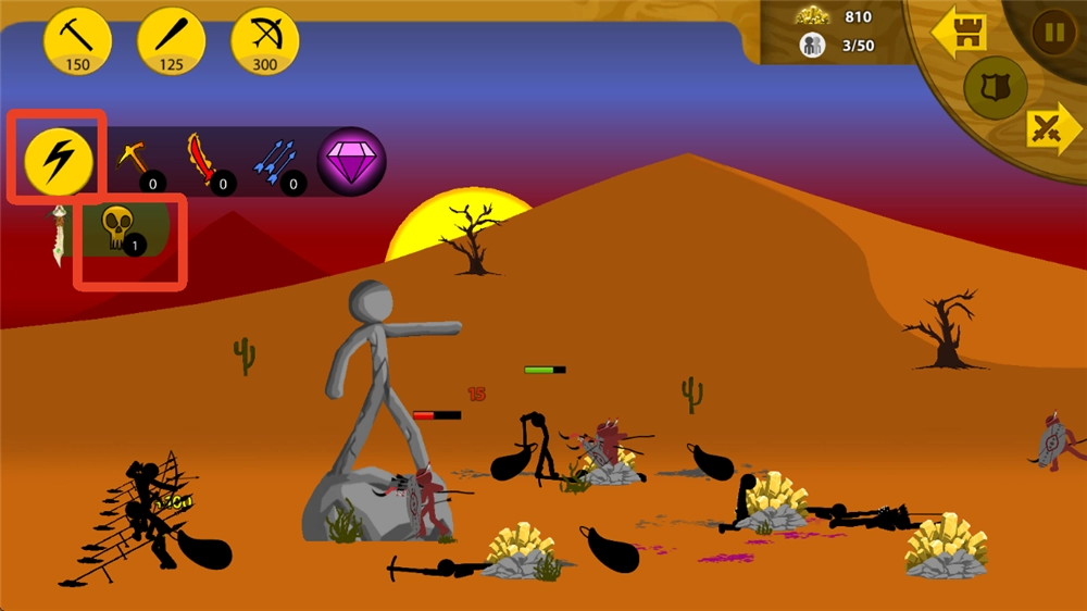 购买成功后,你可以点击战场上左侧那个闪电形状的按钮,接着再选择下方的黄色骷髅。