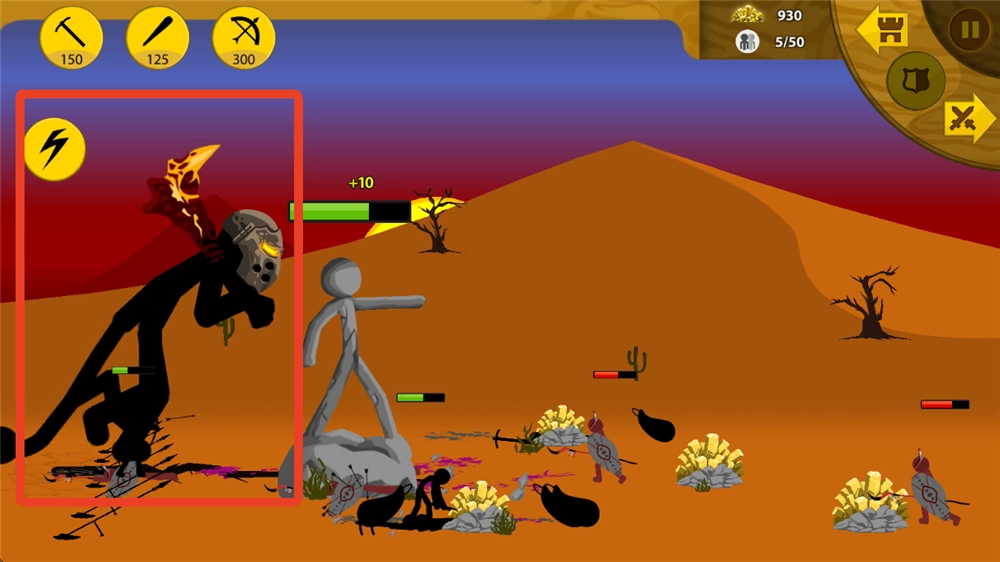 游戏里设置了矿工、剑士、弓箭手、长矛手、法师和巨人六个职业。矿工没有攻击能力,仅能用来采矿;剑士是棍棒手的进阶形态,攻击速度快、造价低、移动速度也快,前期聚集起来能打出不错的伤害,但到了后期就完全成了炮灰;弓箭手在后方进行远程输出,伤害很高,不过自身防御脆弱,一旦被敌人近身就必死无疑;长矛手也就是大家常说的斯巴达,攻防能力都比较均衡,既可以用盾牌抵消弓箭手的大部分伤害,也能用长矛攻击敌人,而且血量也很可观;法师的法术带有爆炸效果,还能召唤最多五个仆从协助攻击,这些仆从的血量比剑士低一些,但攻击伤害和剑士差不多,当然,法师的缺点和弓箭手一样,一旦被近身就会被秒杀;至于巨人,它移动速度慢、造价高、攻击速度也慢,不过每次攻击都能对非巨人单位造成击飞效果,血量低的单位甚至会被直接秒杀,同时巨人的攻击属于范围攻击,能一次性攻击多个敌人,后期如果经济比较宽裕,一定要预留一些资源造一个巨人出来。
